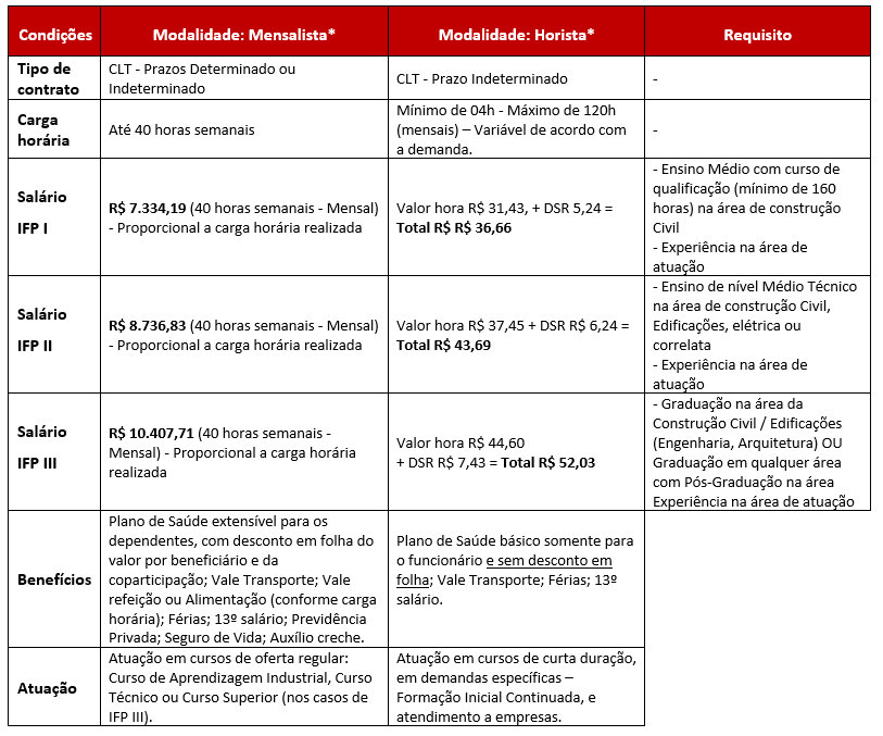 A modalidade de contratação e Carga horária será definida no momento da admissão, de acordo com a necessidade do SENAI.
