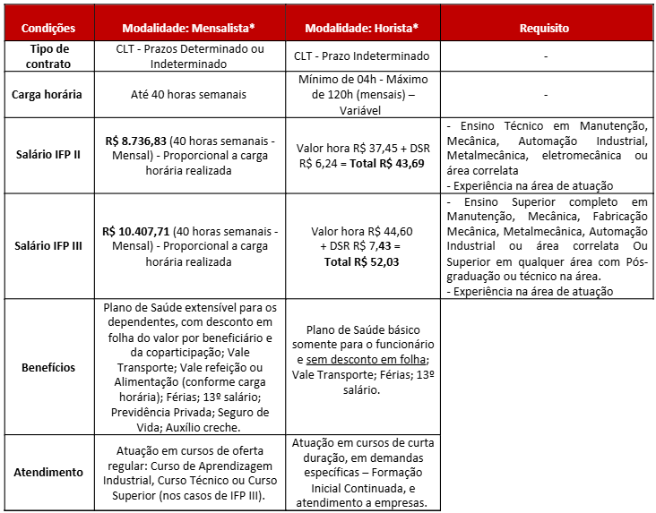 A modalidade de contratação e Carga horária será definida no momento da admissão, de acordo com a necessidade do SENAI.